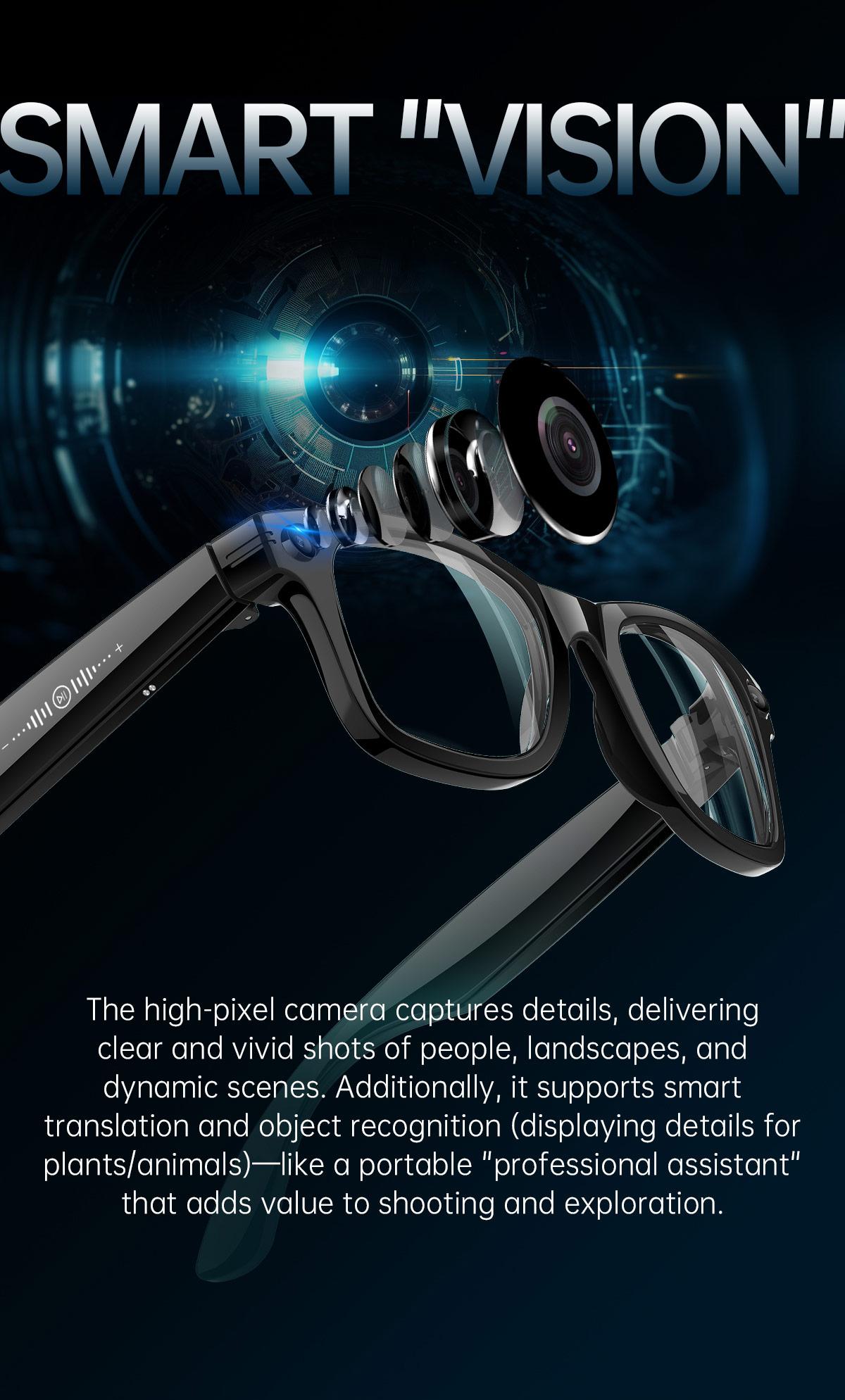 AI Camera & Video Smart Fashion Glasses: AI photo object recognition with answers, AI voice wake-up, AI intelligent Q&A interaction, and AI translation. It supports photography, video recording (with anti-shake function), and audio recording.