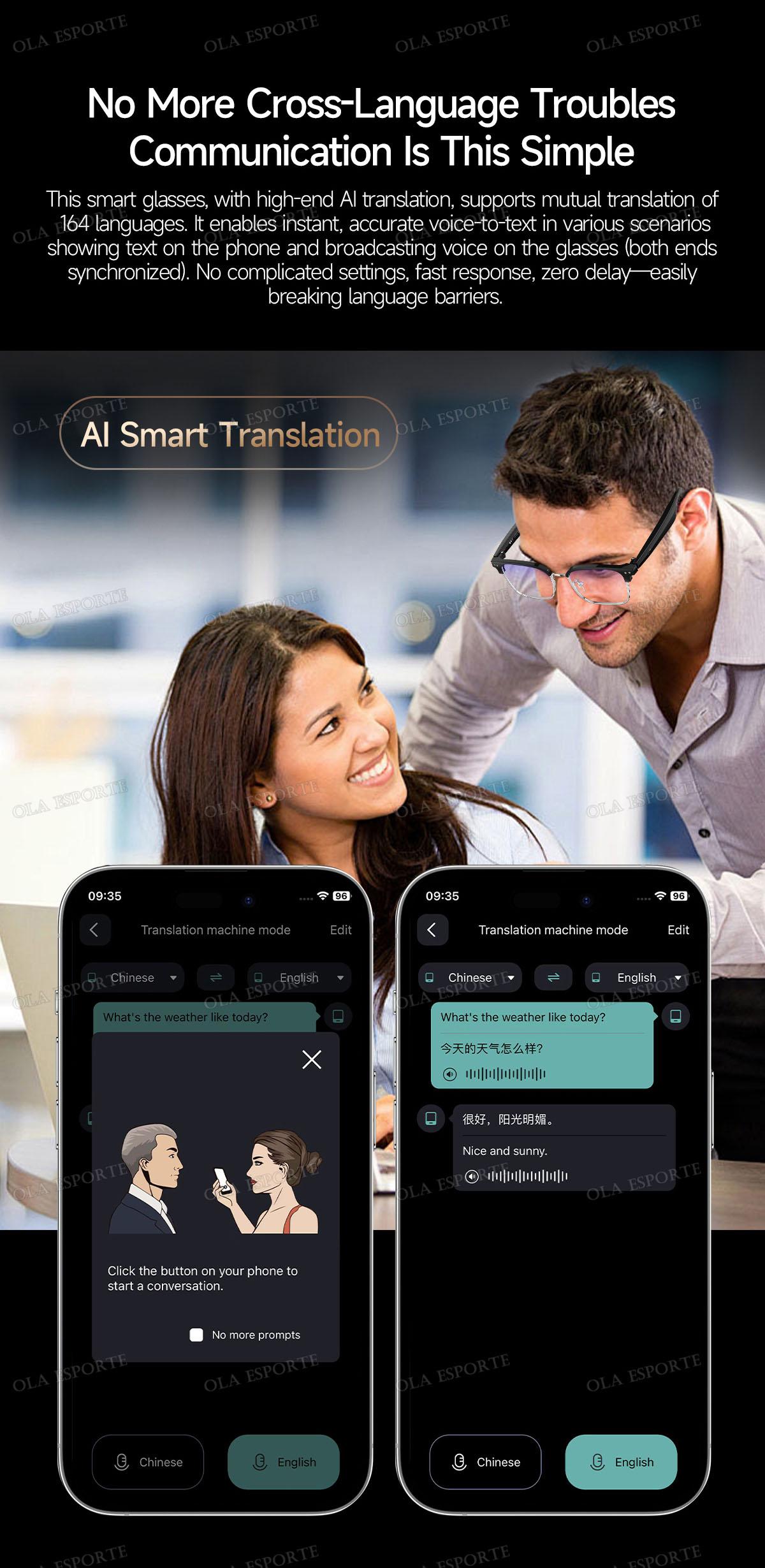 AI Smart Translation Glasses Bluetooth Call Remote Music 163 Video Online Language Translator Voice Note UV400 Sunglasses 2025
