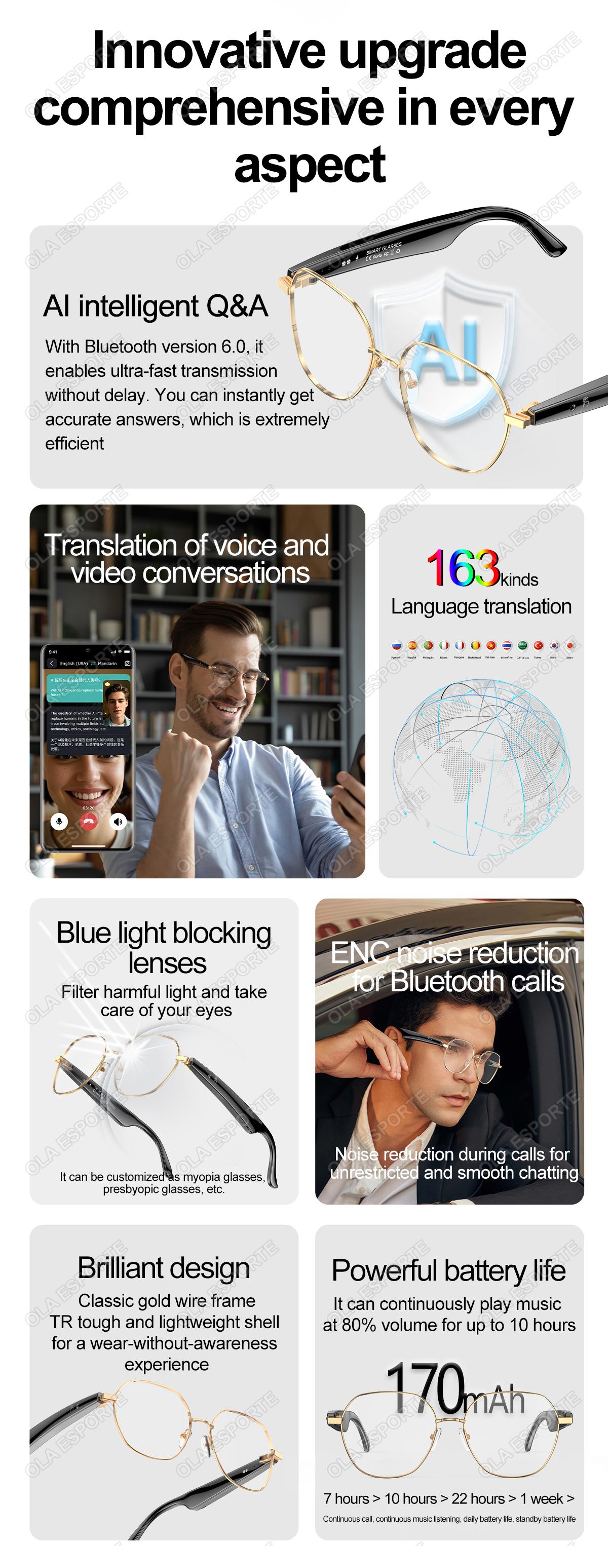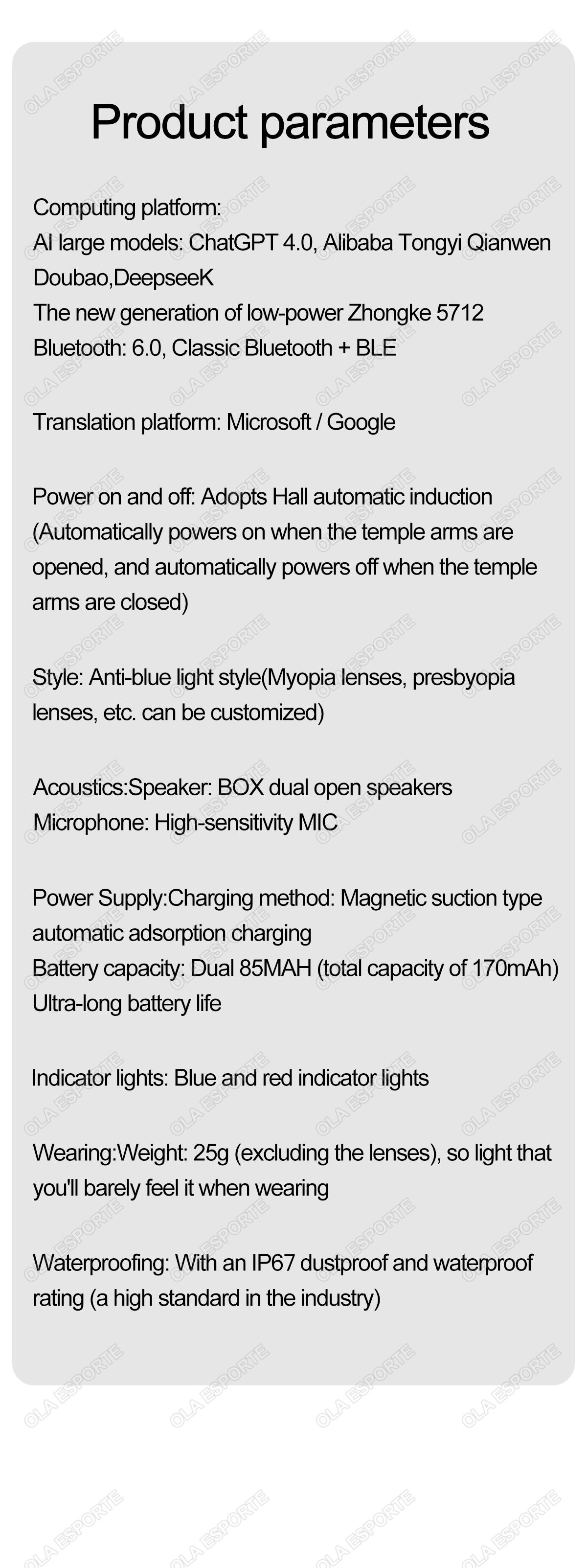 AI Bluetooth Audio - call Fashion Smart Glasses: AI conversation, AI intelligent translation (Translator mode, Glasses + Mobile phone translation mode. Capable of customizing translations for over 134 languages), voice notes, sleep - aid mode, photo translation, remote - controlled photo taking, Bluetooth call, intelligent Hall - effect sensor for automatic power - on/off, intelligent voice assistant, music playback (switching and pausing for music enjoyment), remote - controlled photo taking. It uses the low - power - consumption AB5712F chip, ensuring long - lasting battery life. Weighing only 25g, it provides a comfortable and unnoticeable wearing experience. It can be equipped with various lenses such as sunglasses, blue - light - blocking lenses, and myopic lenses.
