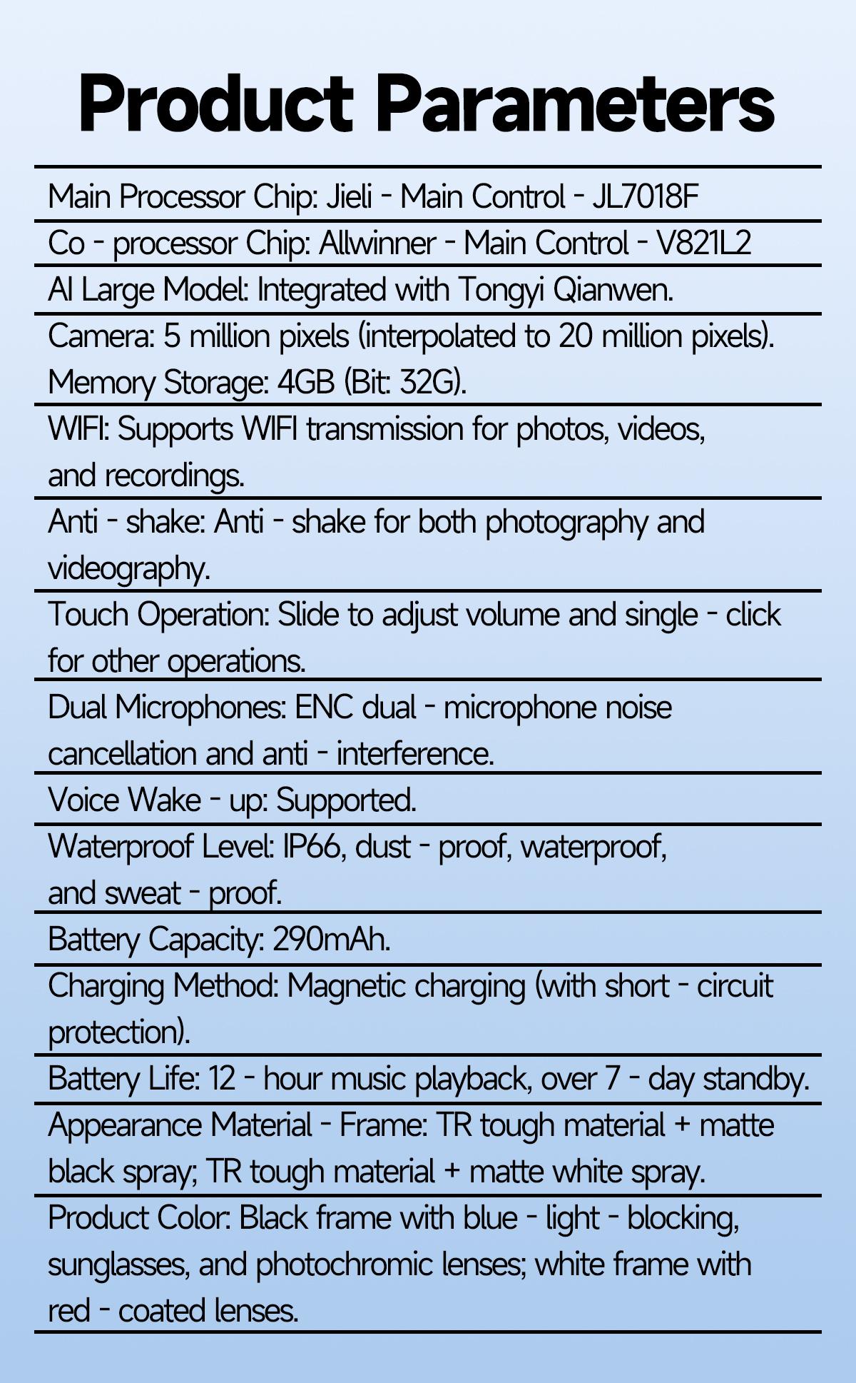 It can transfer photos, videos, etc. to mobile phones via WIFI. It features slide touch for volume adjustment and wear detection. Equipped with dual microphones with ENC noise reduction, it supports Bluetooth calling and music playback (with track switching and pause for music enjoyment).It adopts Jerry + Allwinner main control chips with low power consumption and low latency, ensuring long battery life. It offers convenient operation with two physical buttons plus slide touch, an ultra-light 37g design for a weightless wearing experience, and is configurable with various lenses such as sunglasses, blue light-blocking, photochromic, and myopic lenses.It has a 290mAh large battery and an IP66 rating for dust, water, and sweat resistance.