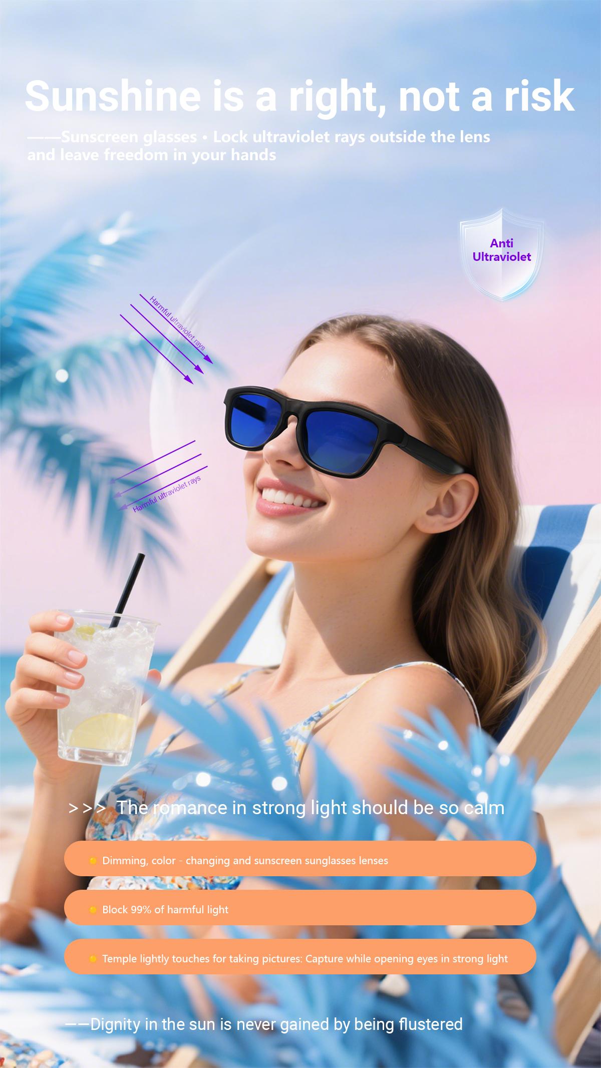 The glasses are equipped with liquid crystal variable light lenses. By touching the glasses temple, the color of the lenses can be changed, effectively blocking ultraviolet rays.