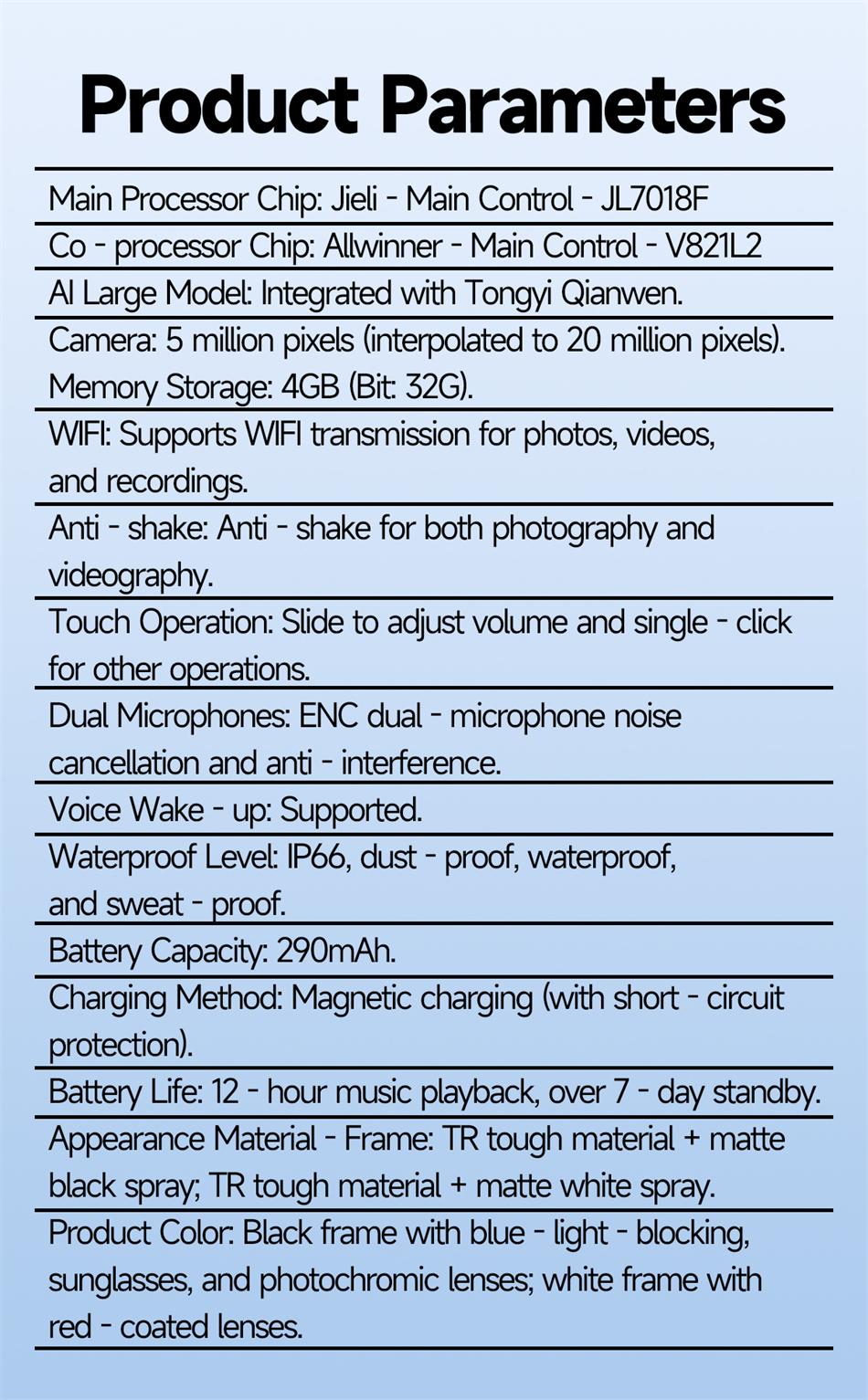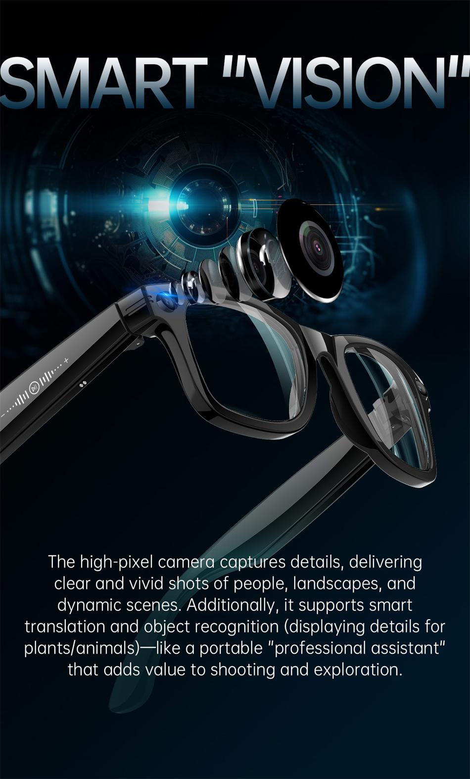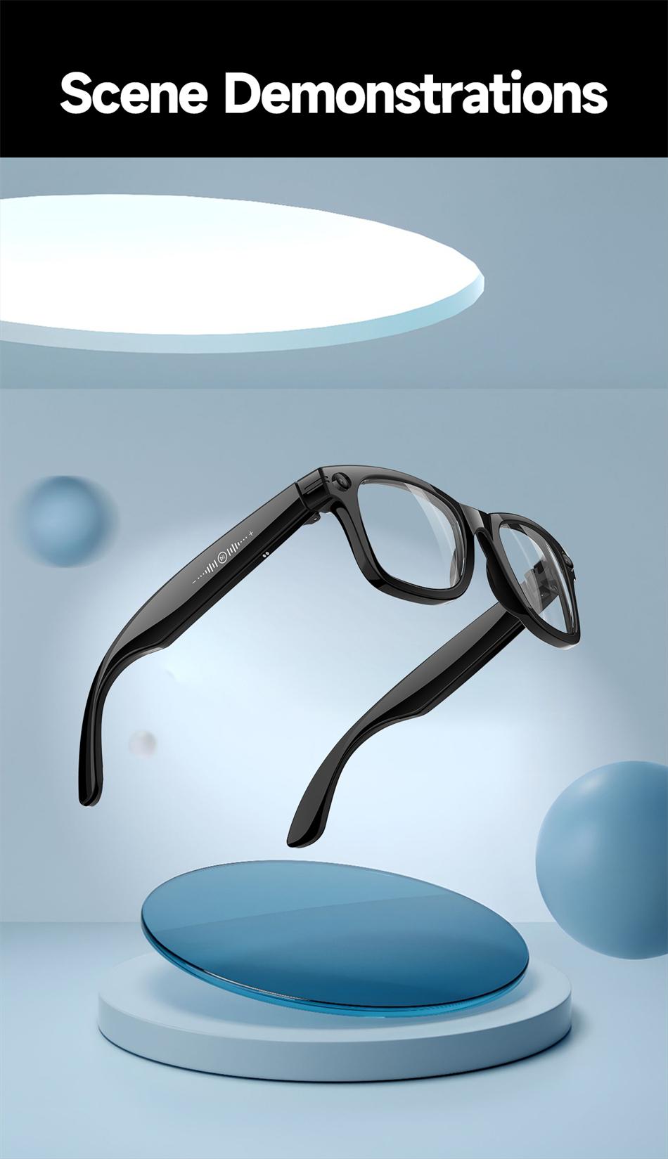 AI Photography and Camera Fashion Smart Glasses: AI Photo Recognition Answer, AI Voice Wake up, AI Intelligent Q&A Interaction, AI Translation, Photography, Video Recording, with Anti Shake Function, Recording, WIFI Image Transfer to Phone (Photos and Videos, etc.), Sliding Touch to Adjust Volume, Wear Detection, Dual microphone Wind ENC Noise Reduction, Bluetooth Call, Music Play (Switching, Pause Music Appreciation), Low Power Low Delay Jerry+Full Star Main Control Chip, Long lasting Battery Life, Dual Physical Buttons+Sliding Touch Convenient Operation, 37g Lightweight Sensorless Wear, Configurable Sunglasses, Anti Blue Light, Color Change, Myopia and Other Lenses, 290mAh Large Battery IP66 dustproof, waterproof, and sweat proof.