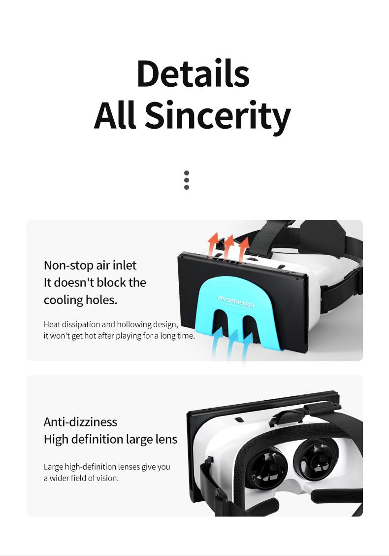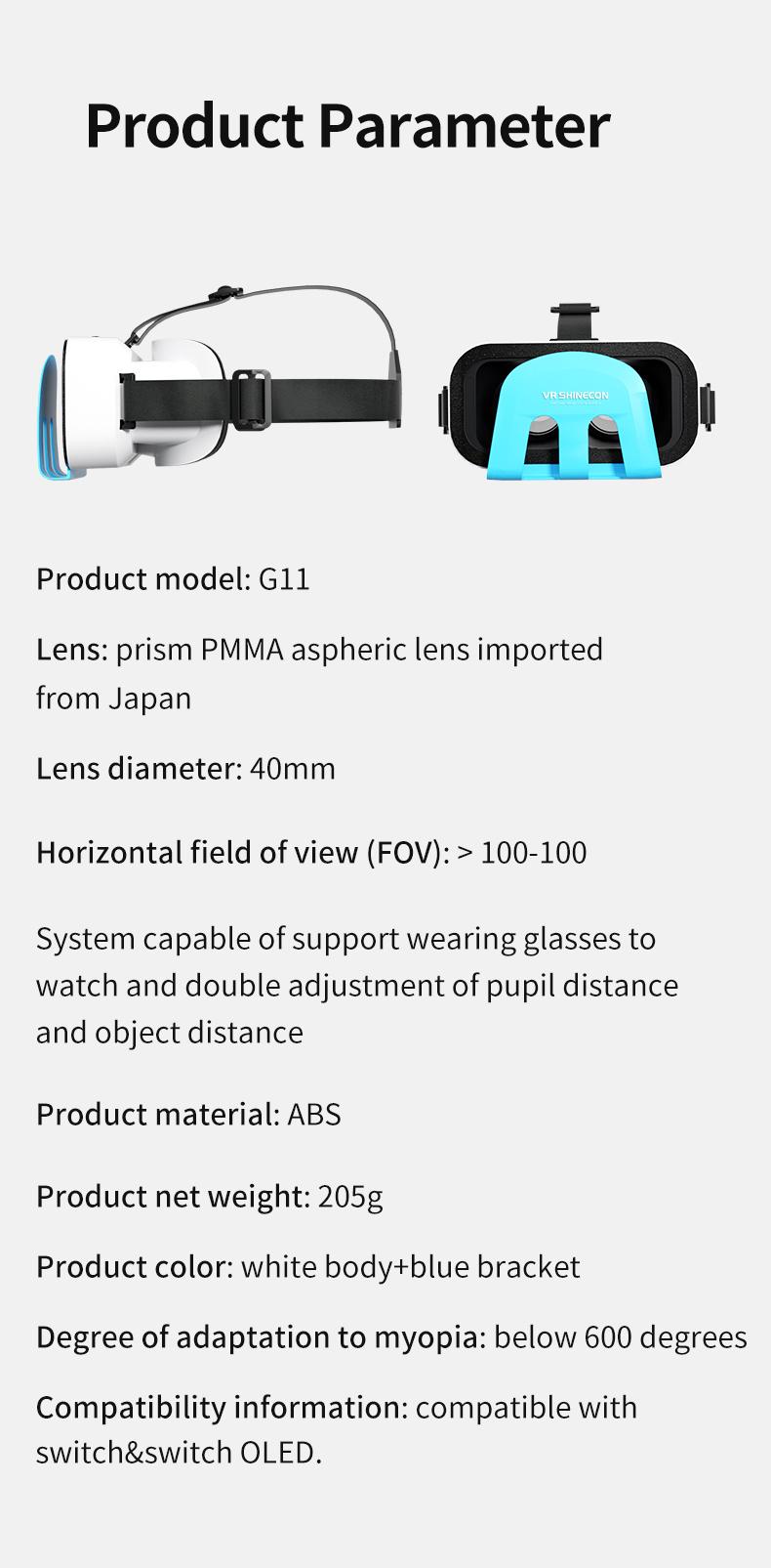 Product model:G11 Lens:prism PMMA aspheric lens imported from Japan Lens diameter:40mm Horizontal field of view (FOV):100-100 System capable of support wearing glasses to watch and double adjustment of pupil distance and object distance Product material:ABS Product net weight:205g Product color:white body+blue bracket Degree of adaptation to myopia:below 600 degrees Compatibility information:compatible with switch&switch OLED.
