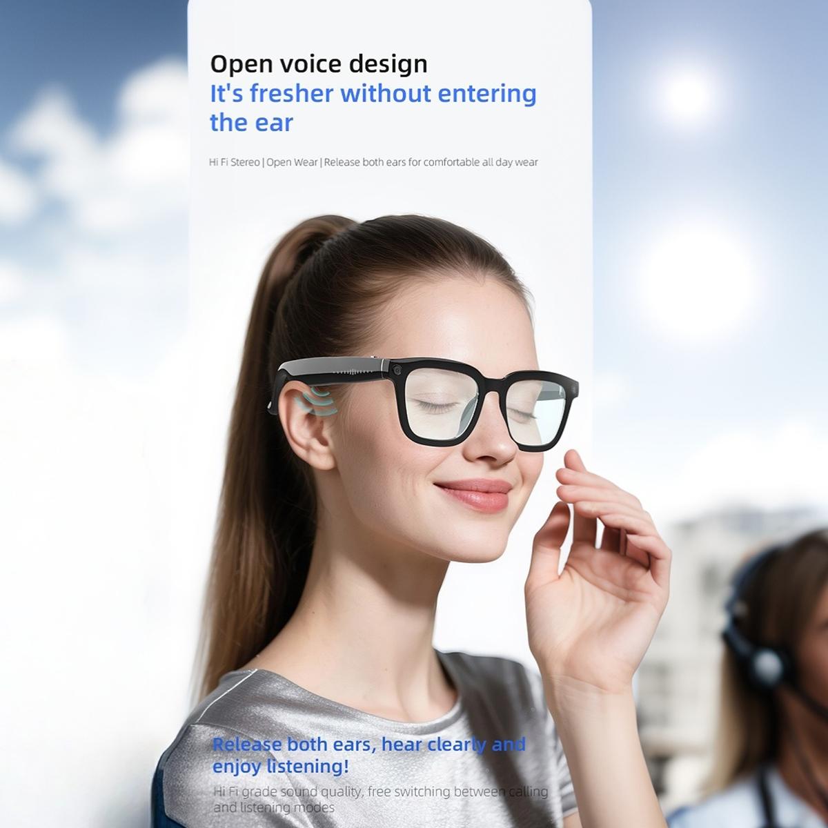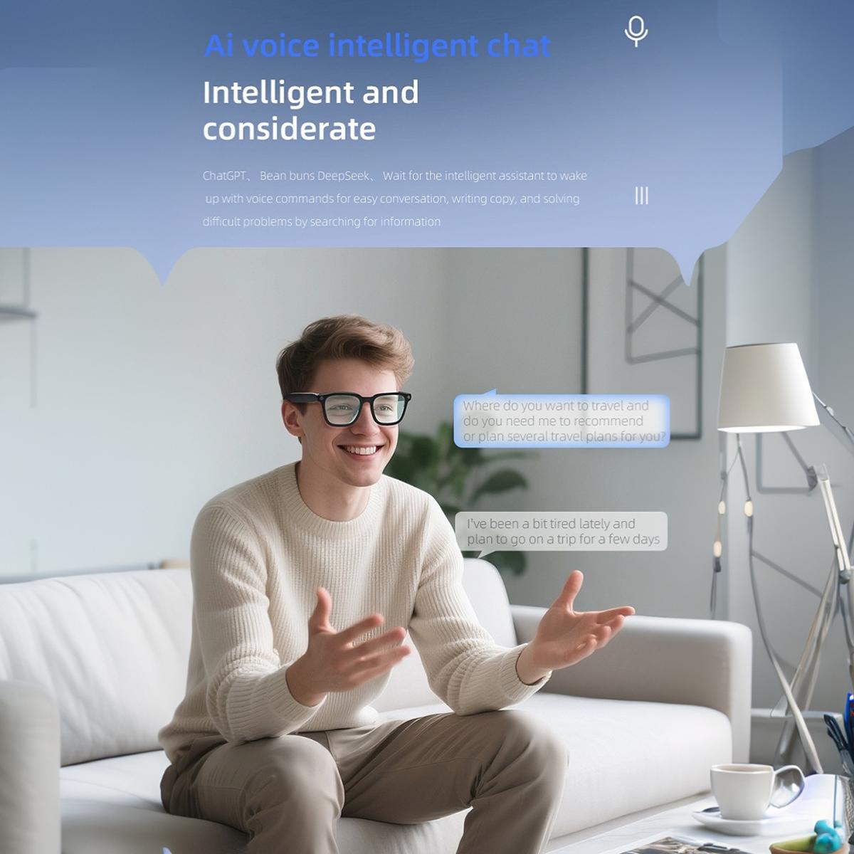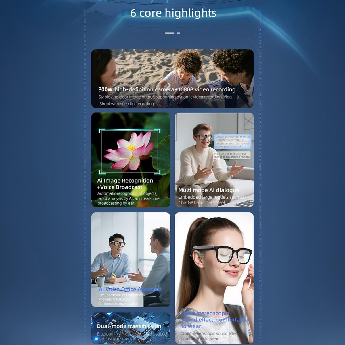 AI Glasses with Camera, Bluetooth Glasses, Noise Cancellation Hello, nice to meet you!Let me give you a brief introduction. We offer a variety of stylish wireless Bluetooth glasses, available in different colors and styles, including standard Bluetooth glasses (without translation function) as well as AI real-time translation glasses that support multiple languages. We also have smart glasses with high-definition photo and video recording, and the app language will default to matching the phone's system language. These glasses are indispensable for business affairs, remote meetings, and sports, combining headphones with glasses to become a music device.