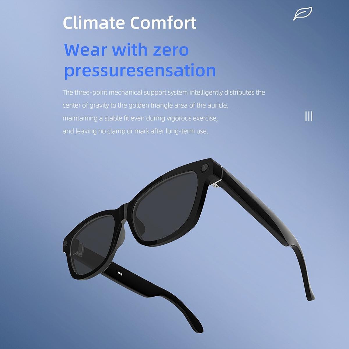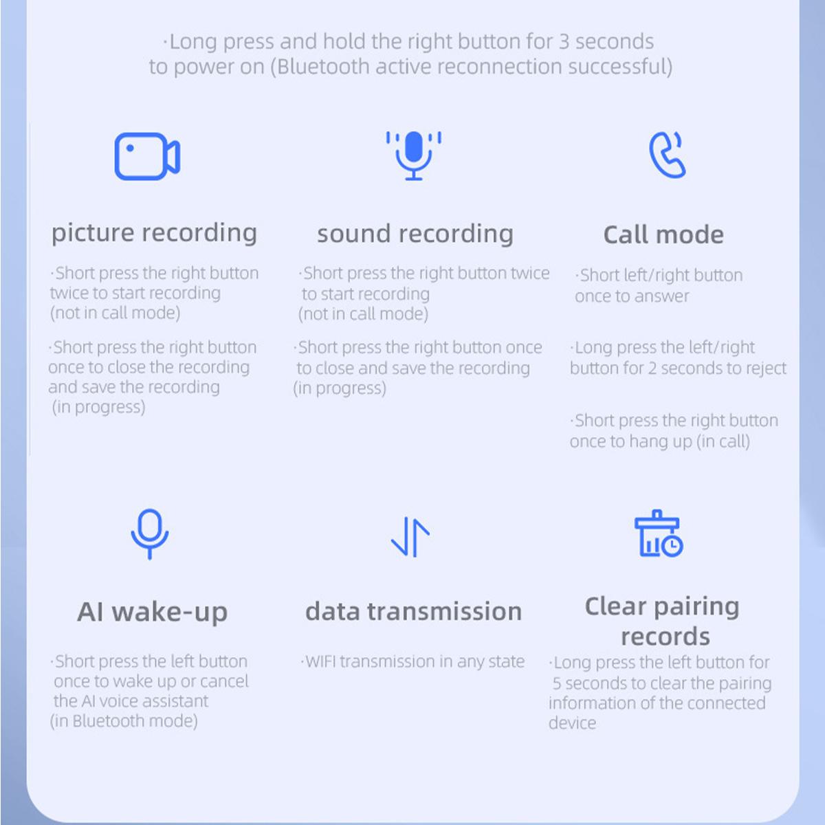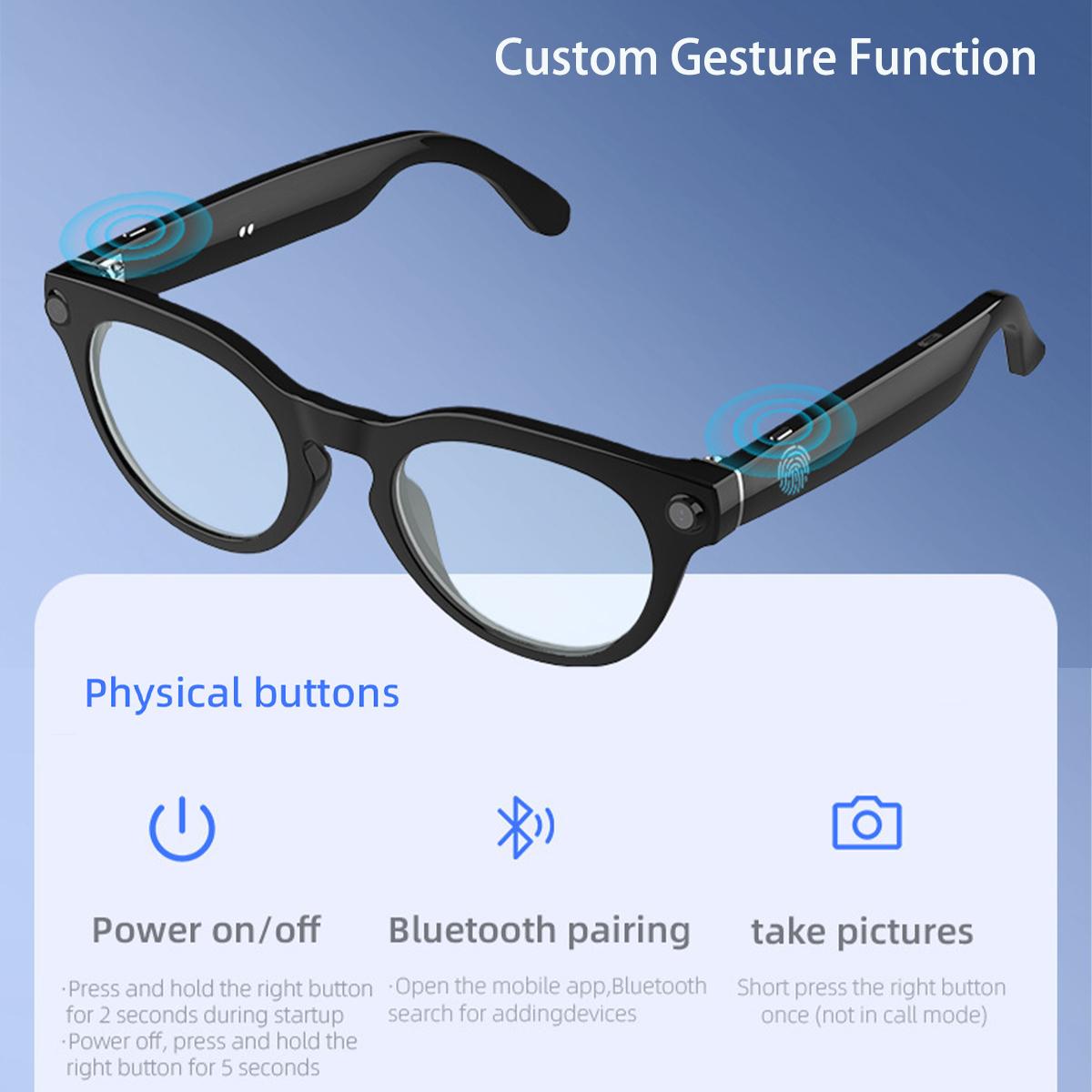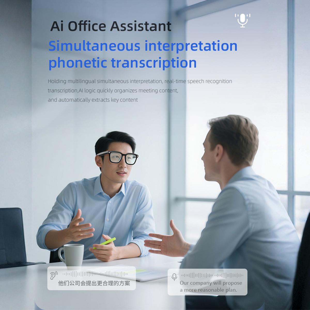 AI Glasses with Camera, Bluetooth Glasses, Noise Cancellation Hello, nice to meet you!Let me give you a brief introduction. We offer a variety of stylish wireless Bluetooth glasses, available in different colors and styles, including standard Bluetooth glasses (without translation function) as well as AI real-time translation glasses that support multiple languages. We also have smart glasses with high-definition photo and video recording, and the app language will default to matching the phone's system language. These glasses are indispensable for business affairs, remote meetings, and sports, combining headphones with glasses to become a music device.