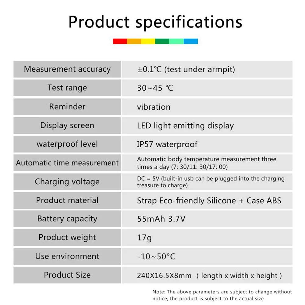 Description: 1.Body temperature measurement: Automatic body temperature measurement throughout the day. When the body temperature reaches ≥ 37.3°C, the bracelet will automatically alert.
