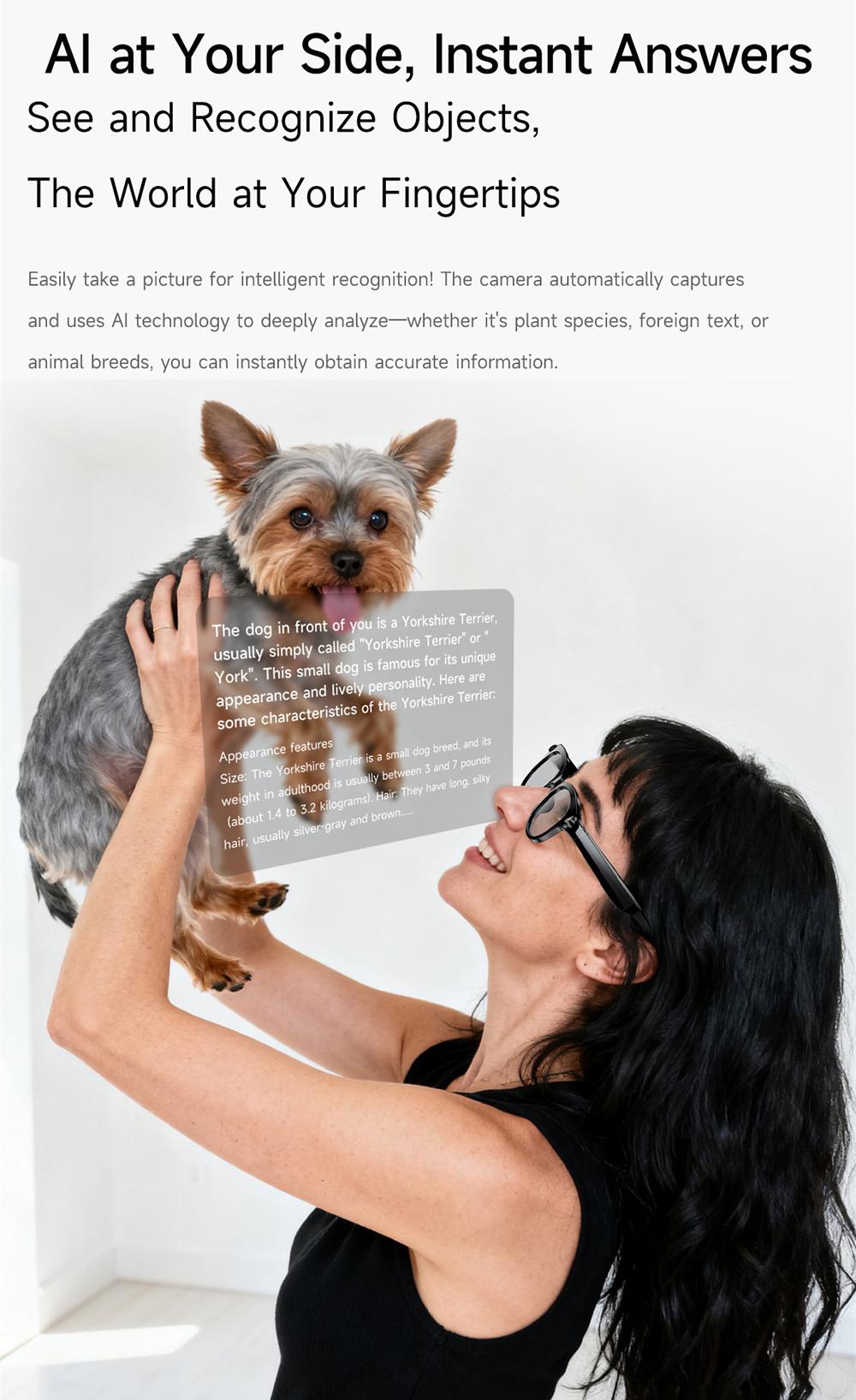 The top-ranked 200W camera in the industry features high pixel density, capturing stable, high-definition video and images without shaking. It offers exceptional clarity with minimal distortion. AI-powered voice assistant/camera/video recording/music control/calling/alarm sound/directional light/AI translation/smart image recognition/touch/voice playback (music control, local music), etc.