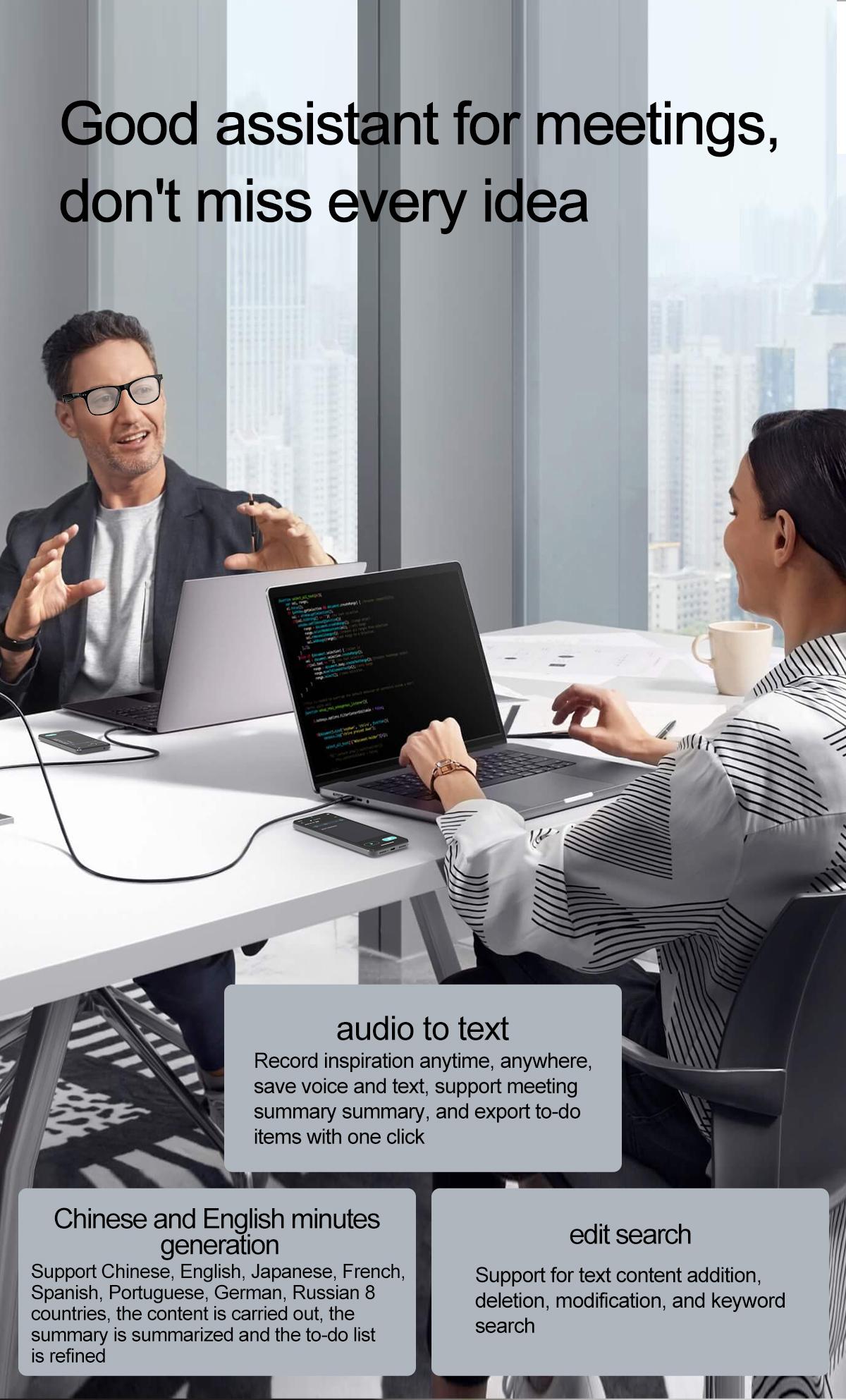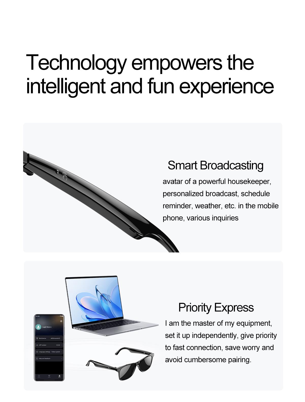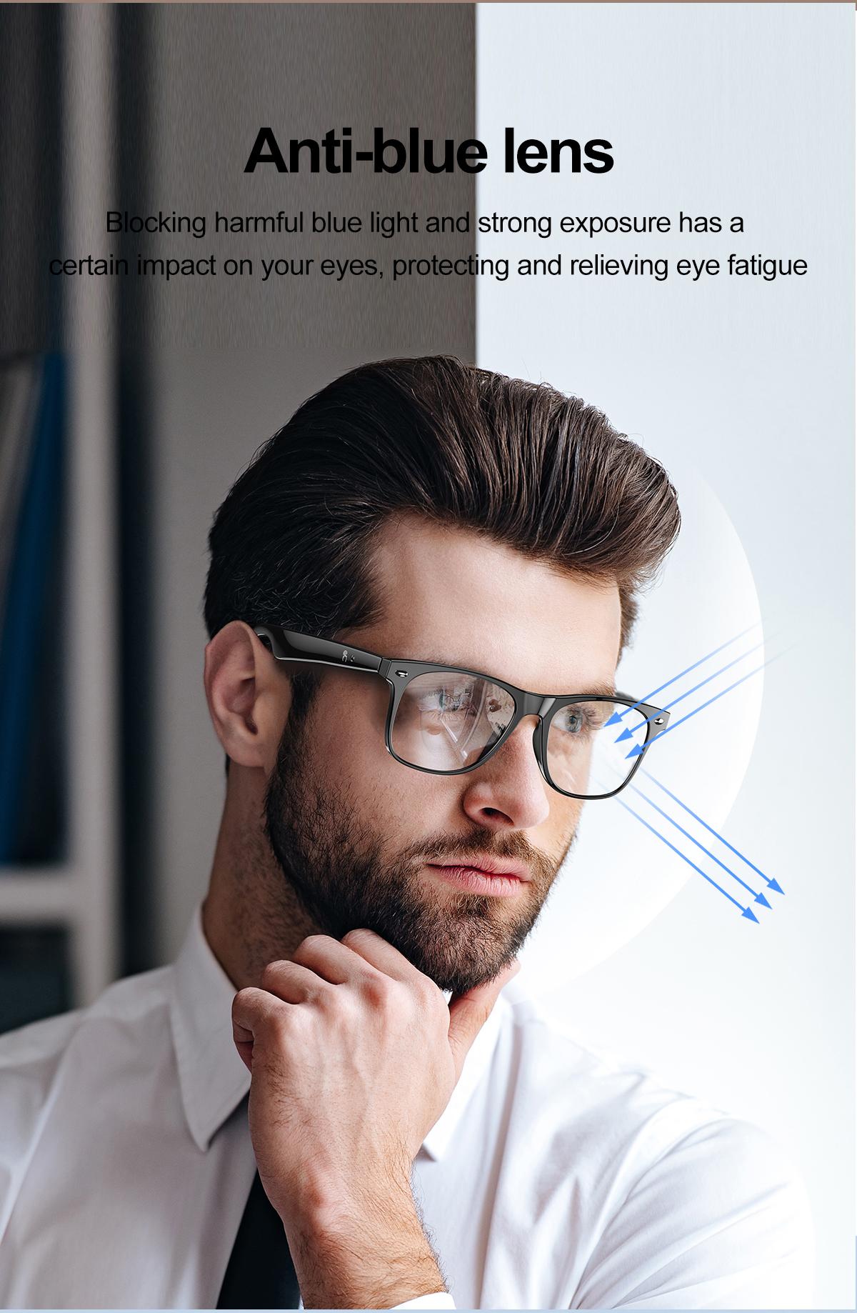 AI dialogue, AI intelligent translation (translation machine mode, glasses + mobile phone translation mode. It can be translated and customized for more than 134 languages) voice notes, sleep aid mode, photo translation, remote control photography, Bluetooth call, intelligent Hall sensing automatic on and off, intelligent voice assistant, music playback (switch, pause music appreciation), remote control photography, use low-power AB5712F low-power chip, long-lasting battery life, 25g lightweight and weightless wearable, comfortable to wear, configurable sunglasses, blue light, myopia and other lenses