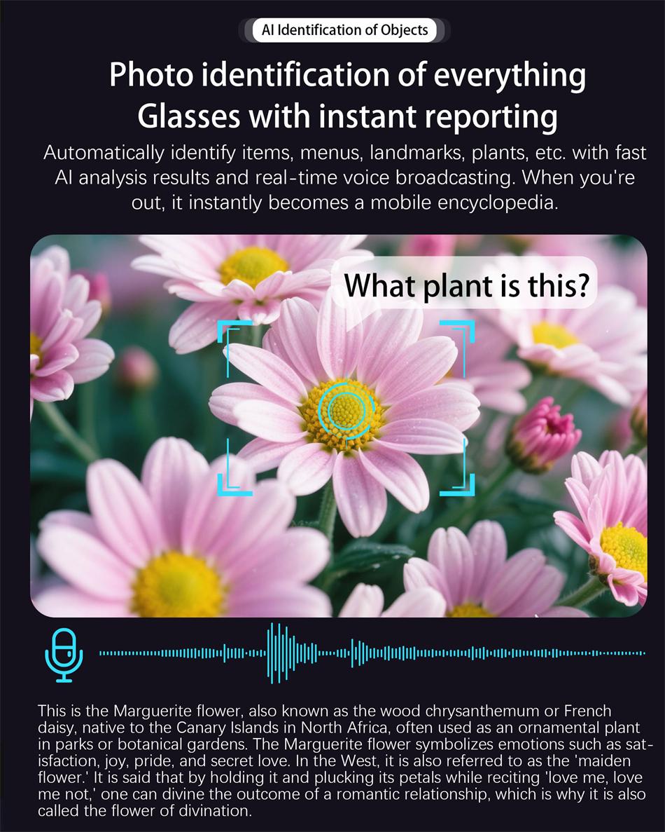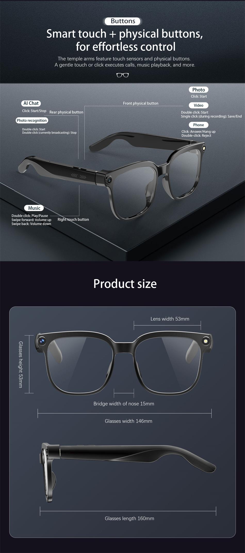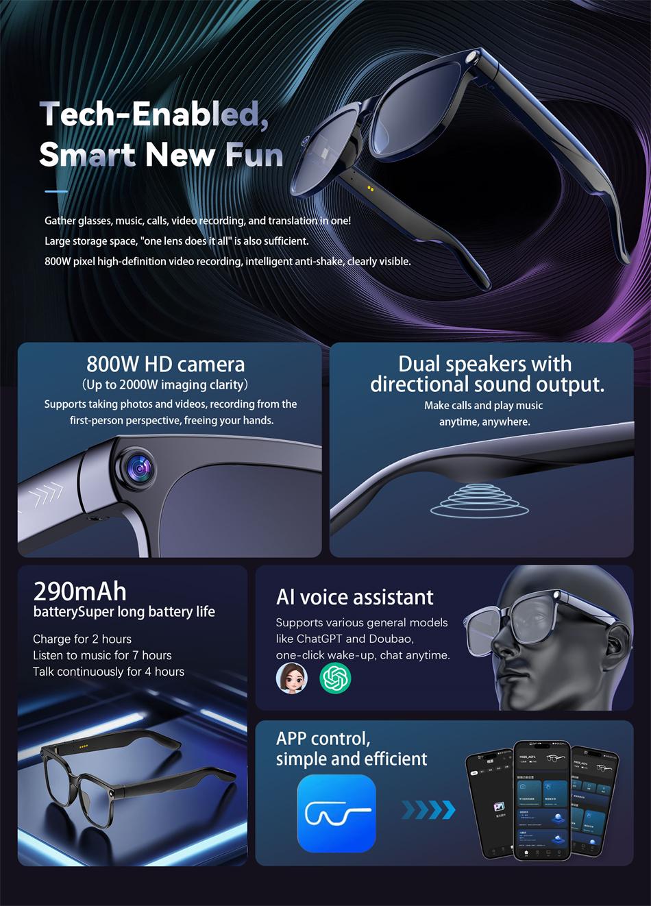 High-definition Sony 800W camera, AI voice wake-up, AI photo object recognition, AI intelligent question-and-answer interaction, AI intelligent translation, high-definition photography and video recording (with anti-shake function), voice recording, WIFI transfer of photos, videos, and recordings to mobile phone, sliding volume adjustment, wearing detection, dual microphone noise reduction, call noise reduction, Bluetooth calling, music playback (switching, pausing music for appreciation), 35g lightweight overall weight for comfortable wearing, configurable sunglasses, blue light blocking, photochromic lenses, 290mAh large battery. IP65 dust and water resistance (potting waterproof process), optimized heating and heat dissipation architecture.
