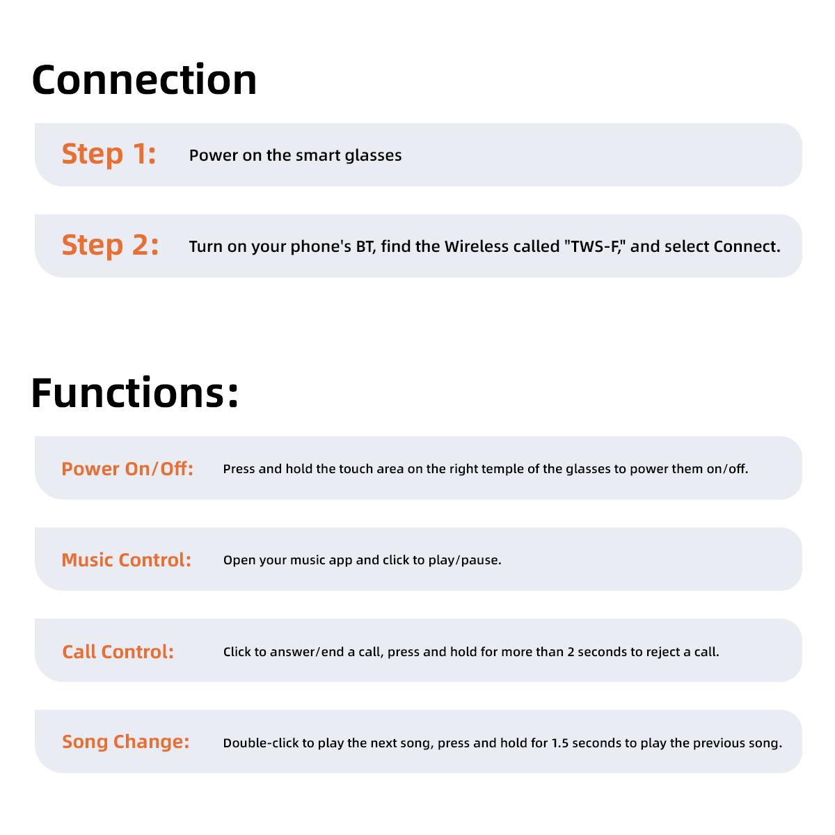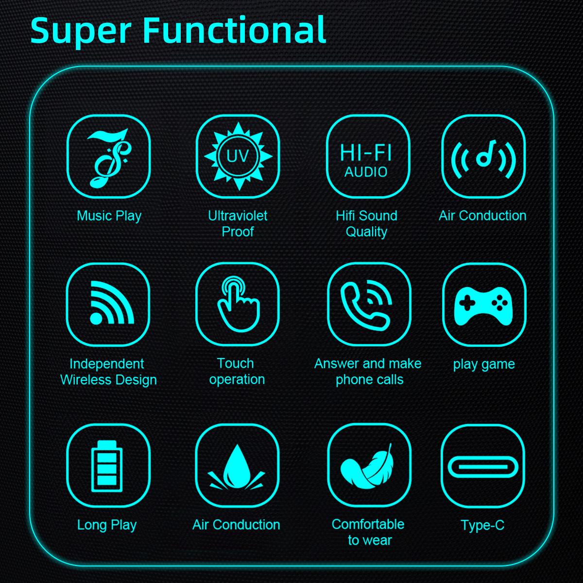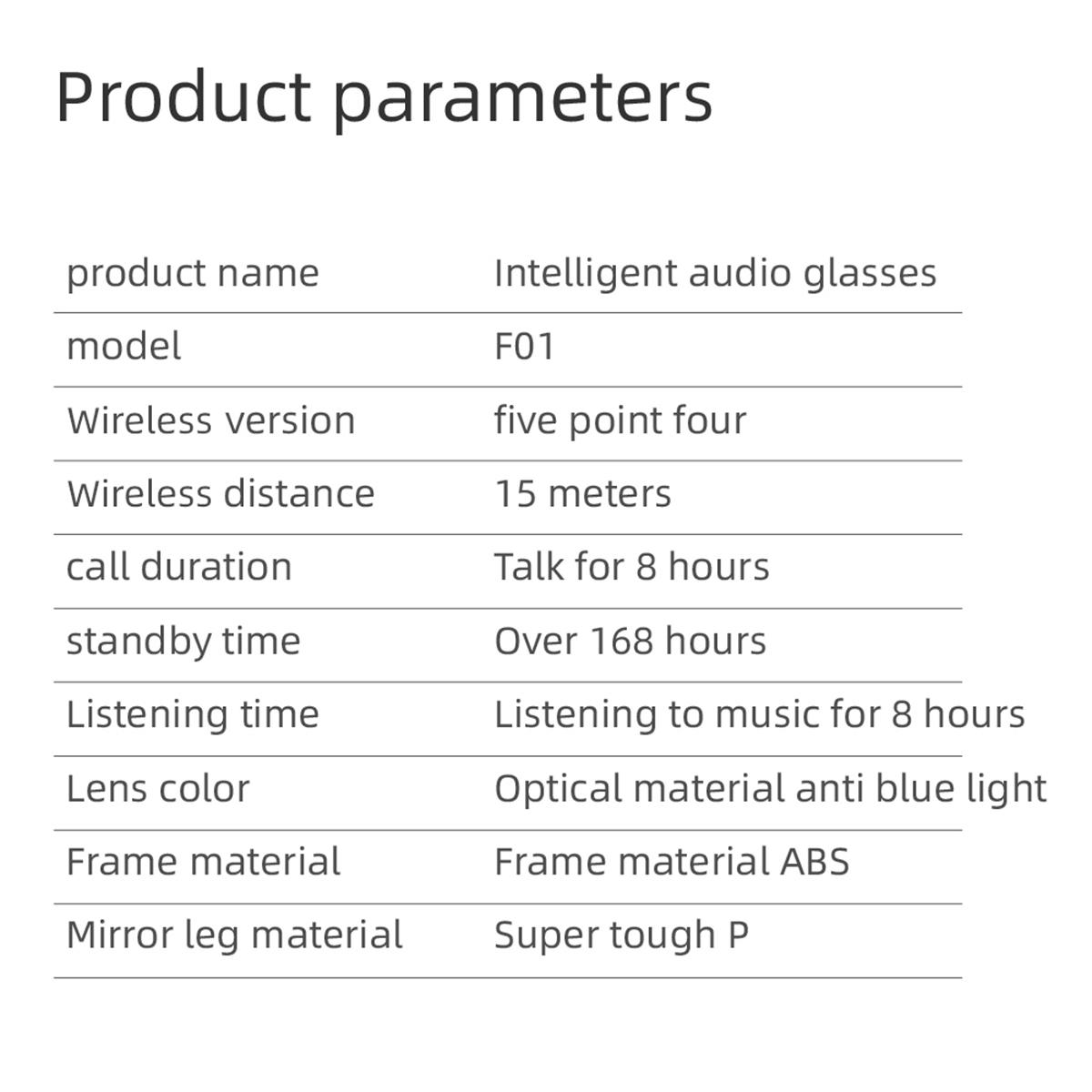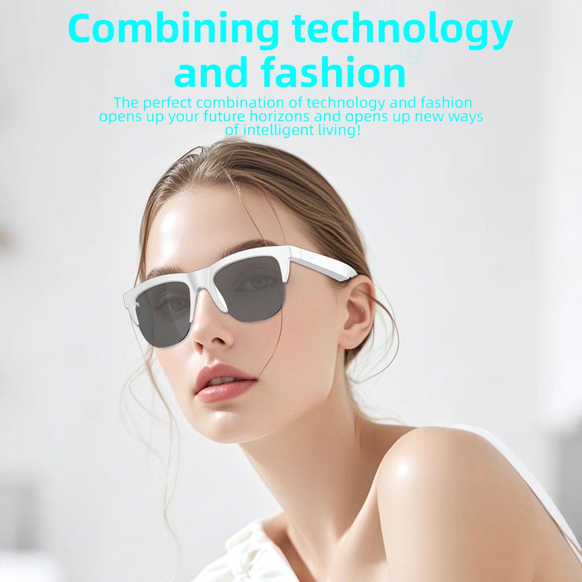 • Smart Touch Control: Tap to wake up the voice assistant, free your hands. •High definition sound quality:360°high-quality sound effects make calls and music clearer and more transparent. • HD UV Protective Lens :Protects your eyes from harmful UV rays while driving or outdoors. • Wireless Bluetooth Headset :Allows you to enjoy your music without the hassle of wires getting in the way. • Waterproof :Can be used in any weather condition without worrying about damage caused by water. • Active Noise-Cancellation :Blocks out external noise, allowing you to focus on your music or calls. • Ultra-Light Design: Only 30g TR900 frame for all-day comfort.