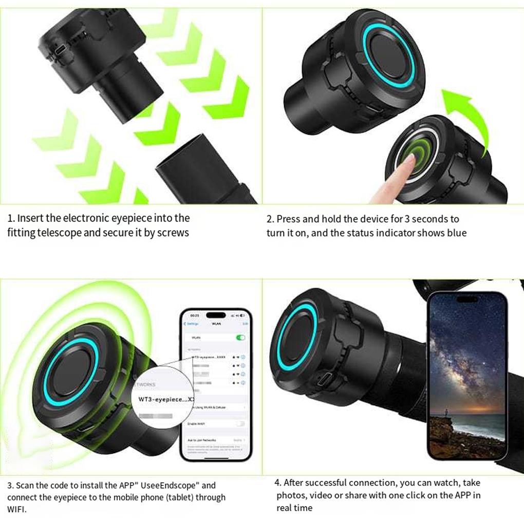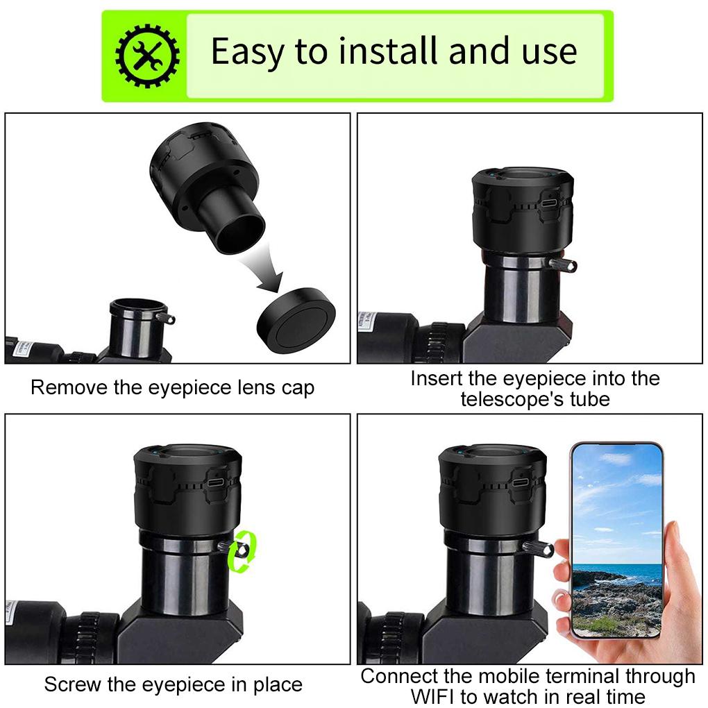 Description: Upgraded 4K HD WIFI Electronic Eyepiece: Enjoy a crisp and clear view of astronomical scenes with the 4K HD resolution and WIFI connectivity, for beginners and seasoned astronomers alike Convenient WiFi Connection: Easily connect your smartphone or tablet to the telescope for real-time viewing, image capture, and video recording, making it a to share your astronomical discoveries with friends and family Long-lasting Battery Life: The built-in 1600mAh lithium battery ensures hours of uninterrupted use, for travel and outdoor observation sessions without worrying about running out of power Portable and Lightweight : Take this upgraded 4K HD WIFI electronic eyepiece astronomical telescope camera wherever you go, thanks to its compact and lightweight construction, making it for bird-watching and stargazing on the go Enhanced Viewing Experience: With 5 million pixels and full-color display, this hot upgraded 4K HD WIFI electronic eyepiece provides a vivid and immersive viewing experience for all your astronomical adventures Specification: Color: As Shown. Material: ABS. Note: There might be a bit color distortions due to different computer resolutions. There might be a slight errors due to different hand measurement. Package Includes: Built in battery 1600mAh Packing list: 1 * WIFI high-definition electronic eyepiece 5-megapixel full-color bird watching mirror 1 * USB cable